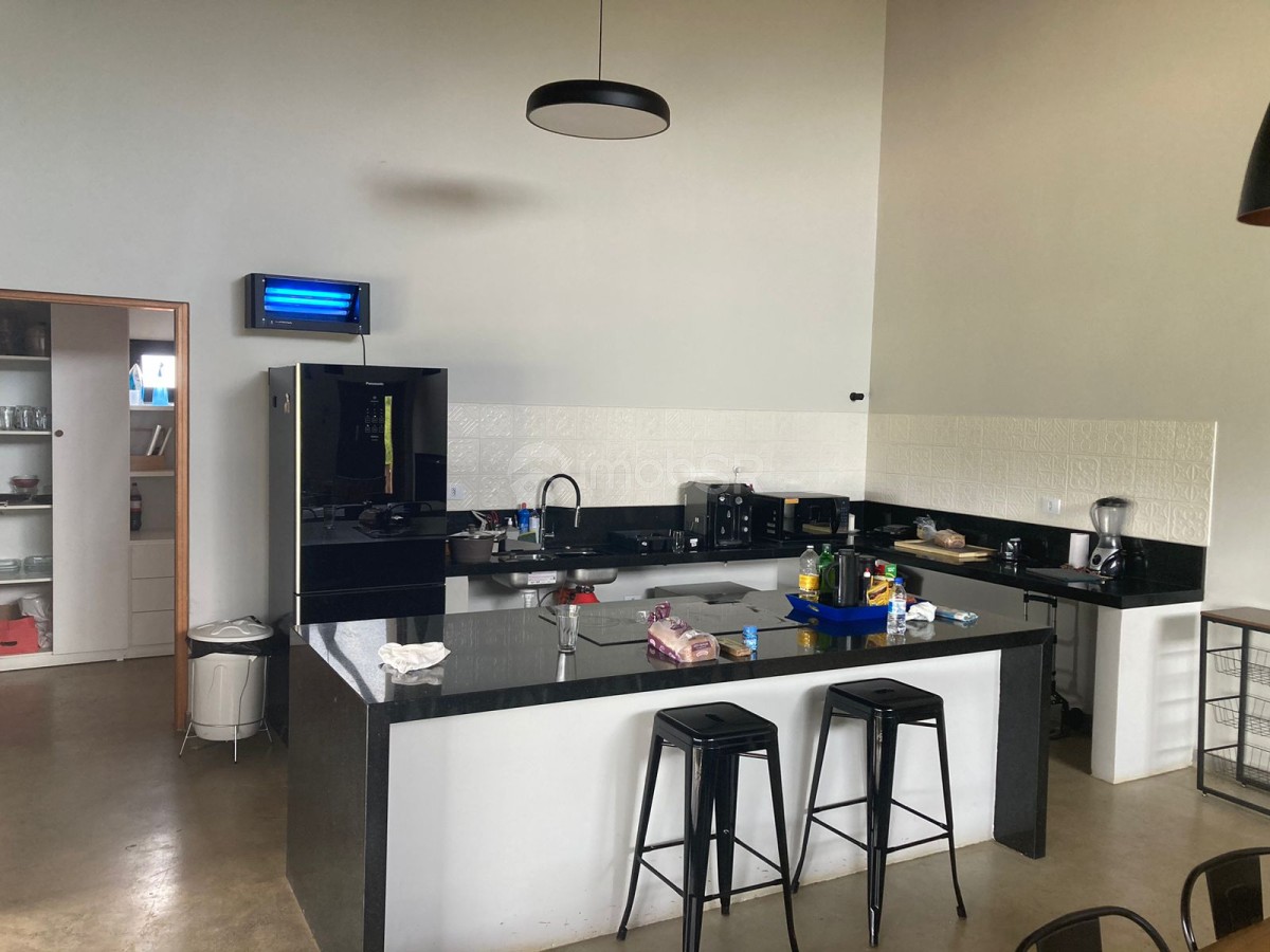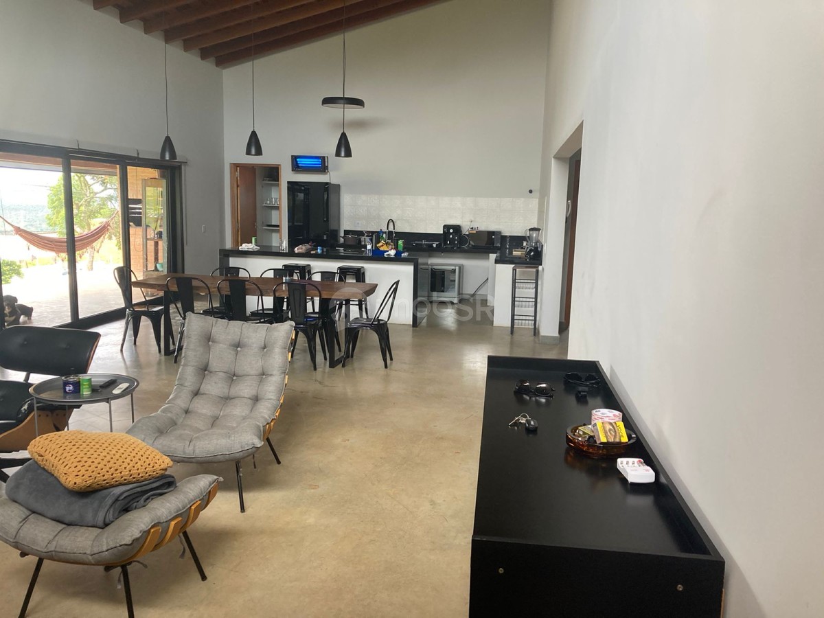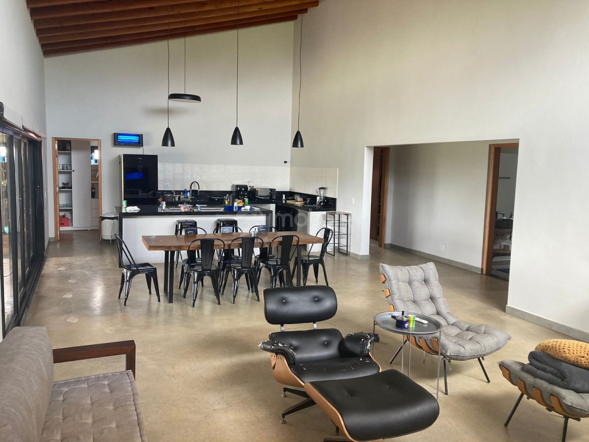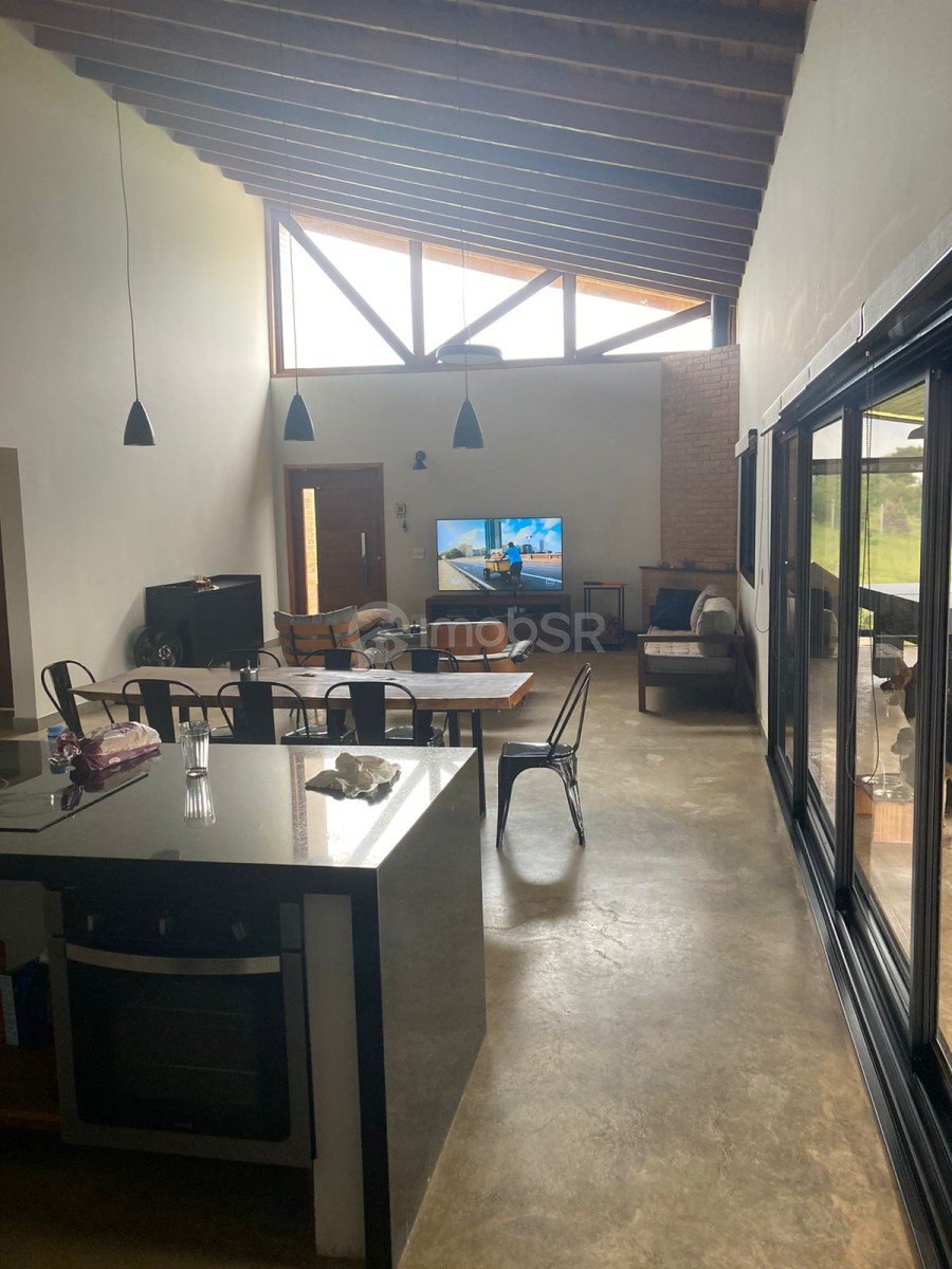 Chácara em condomínio fechado com três dormitórios sendo duas suítes e um revertido para escritório. Suíte principal com closet. Ambiente aberto sincronizando a sala com a cozinha. Possui lareira, varanda com espaço gourmet. Despensa, lavanderia, garagem coberta para dois veículos com portão eletrônico. Área para construção de piscina, campo ou quadra. Localizada no meio do condomínio. Construção nova com produtos de primeira linha.