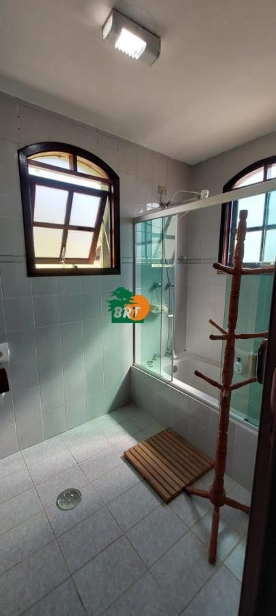 1 banheiro social com armário, espelho e banheira com box de vidro