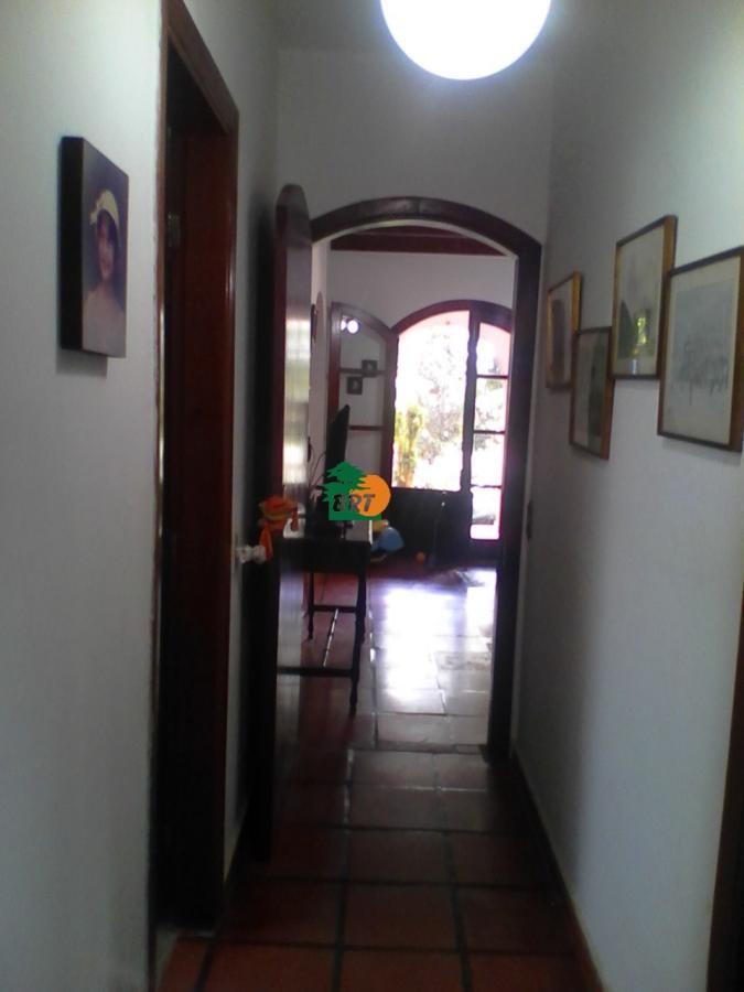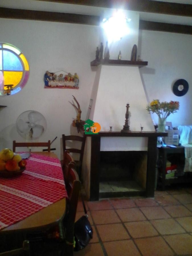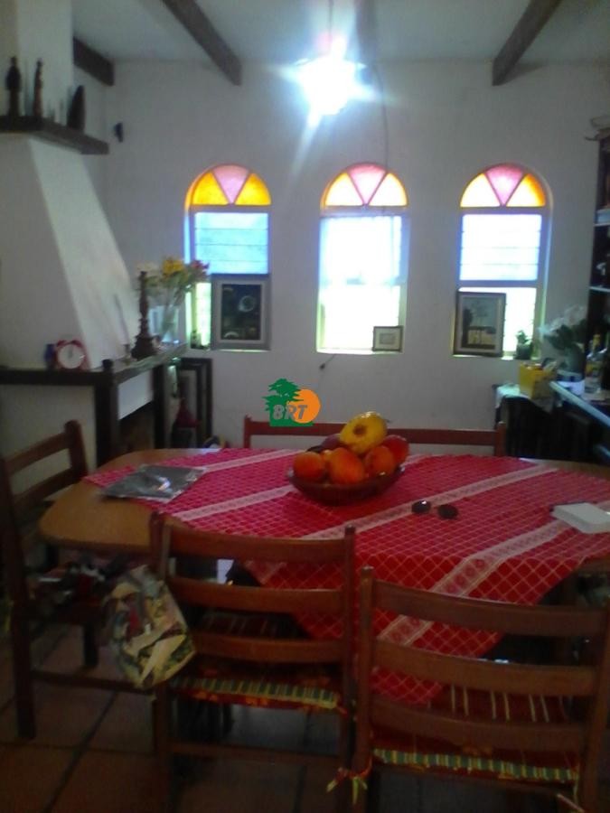Casa principal com 3 dormitórios (sendo 1 suíte), cozinha, sala de jantar com lareira, sala de estar e banheiro social.
