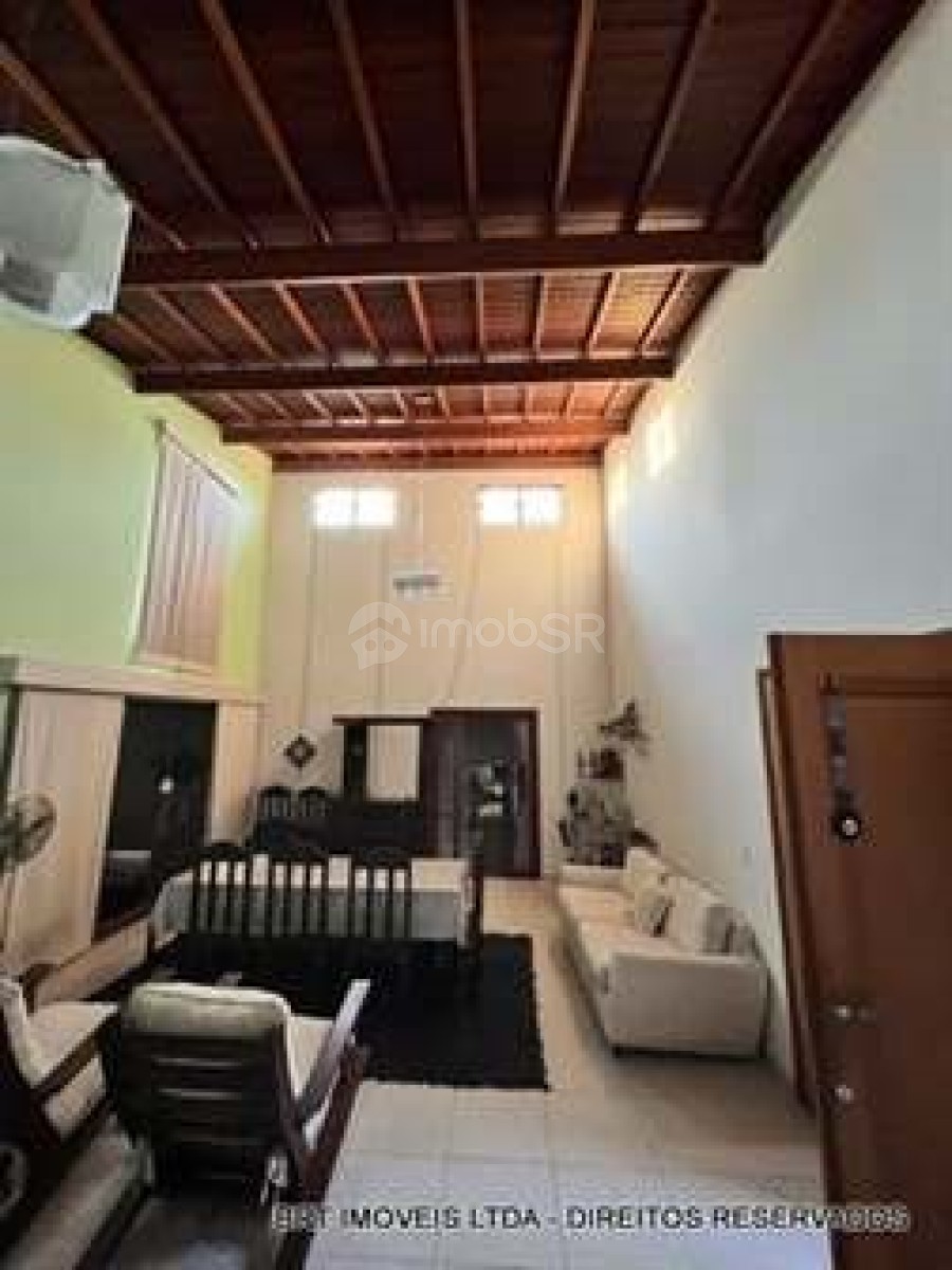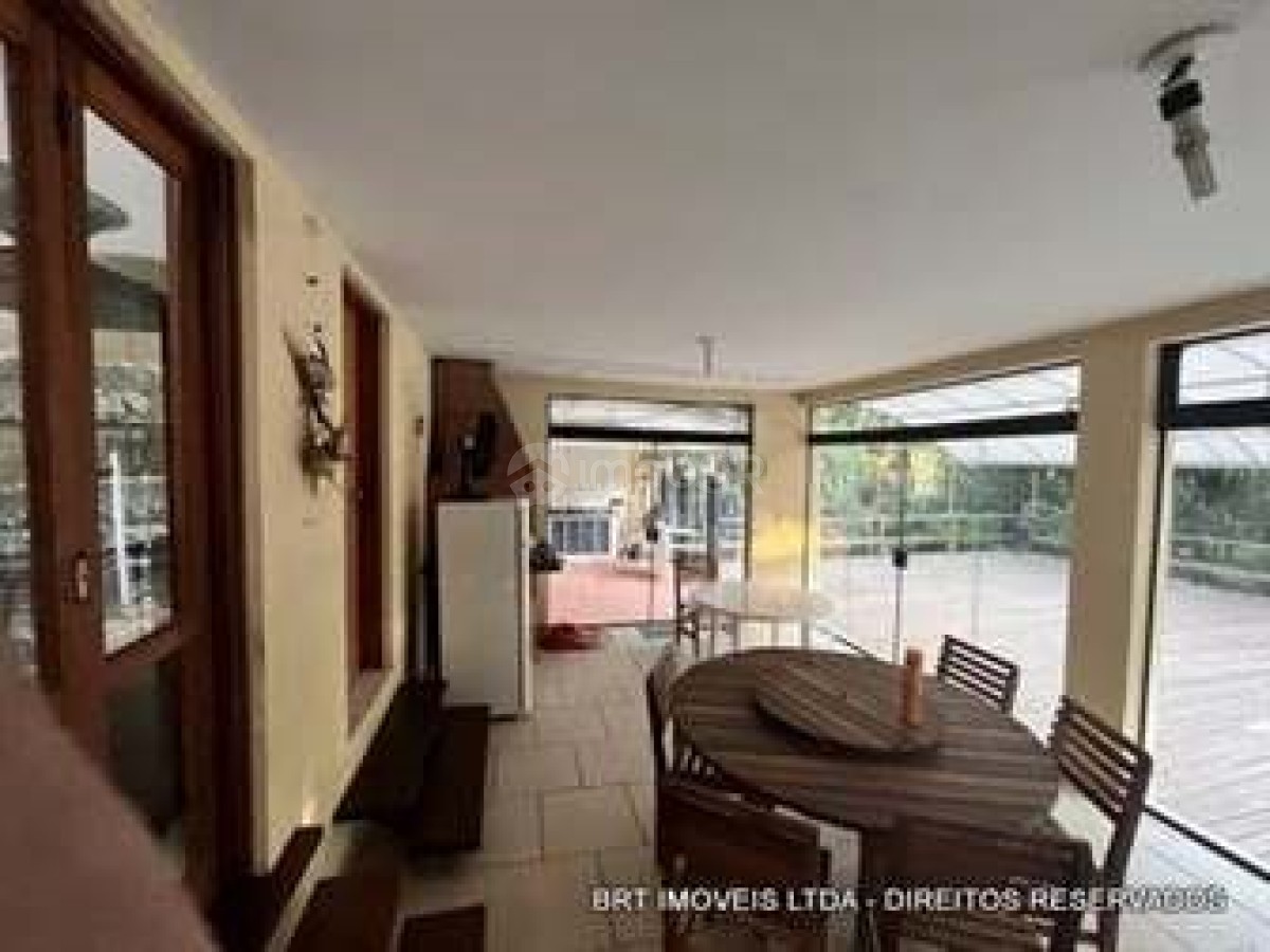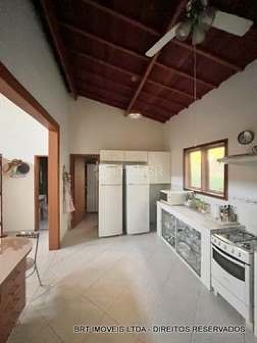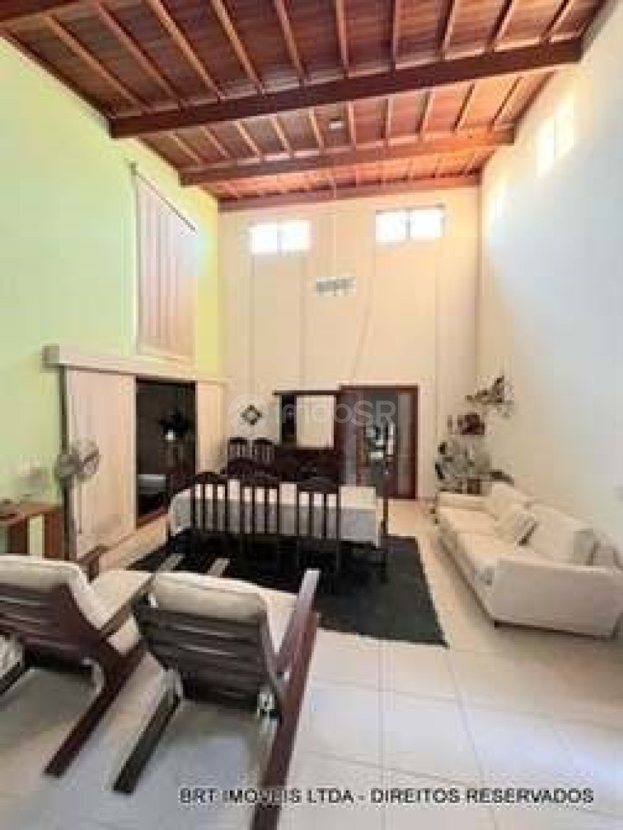 Salas: Sala de estar e jantar com pé direito de 5 metros e teto revestido em madeira de lei; Sala de TV com lareira
