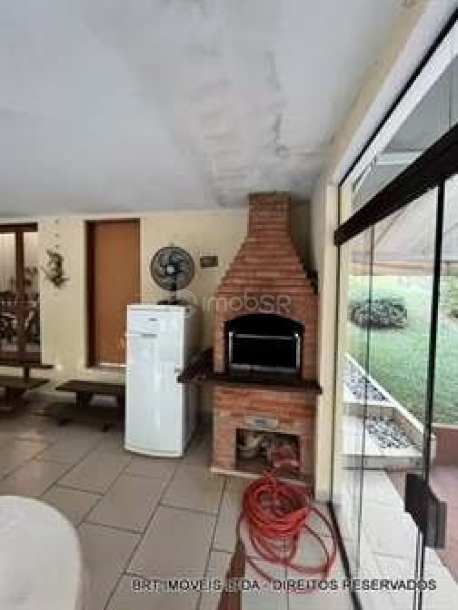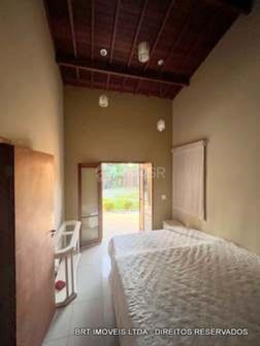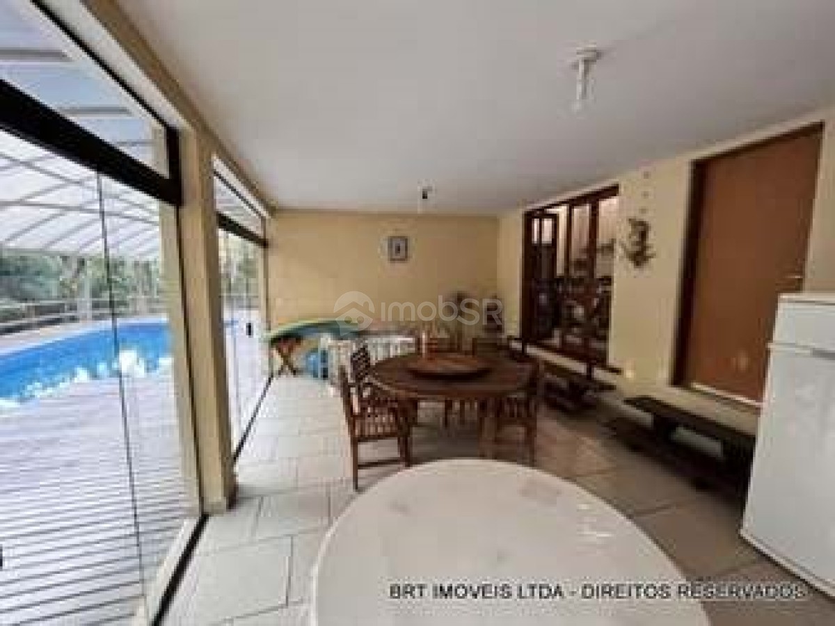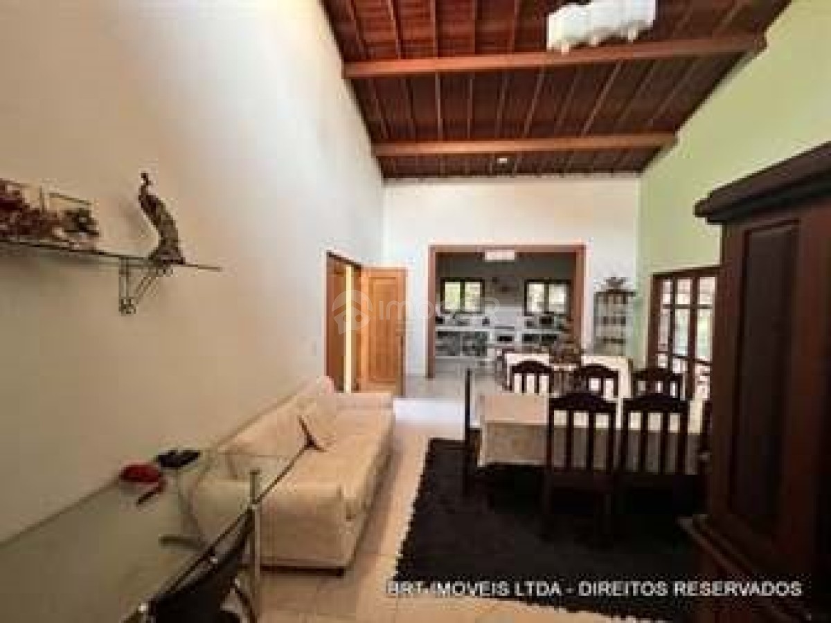 Salas: Sala de estar e jantar com pé direito de 5 metros e teto revestido em madeira de lei; Sala de TV com lareira
