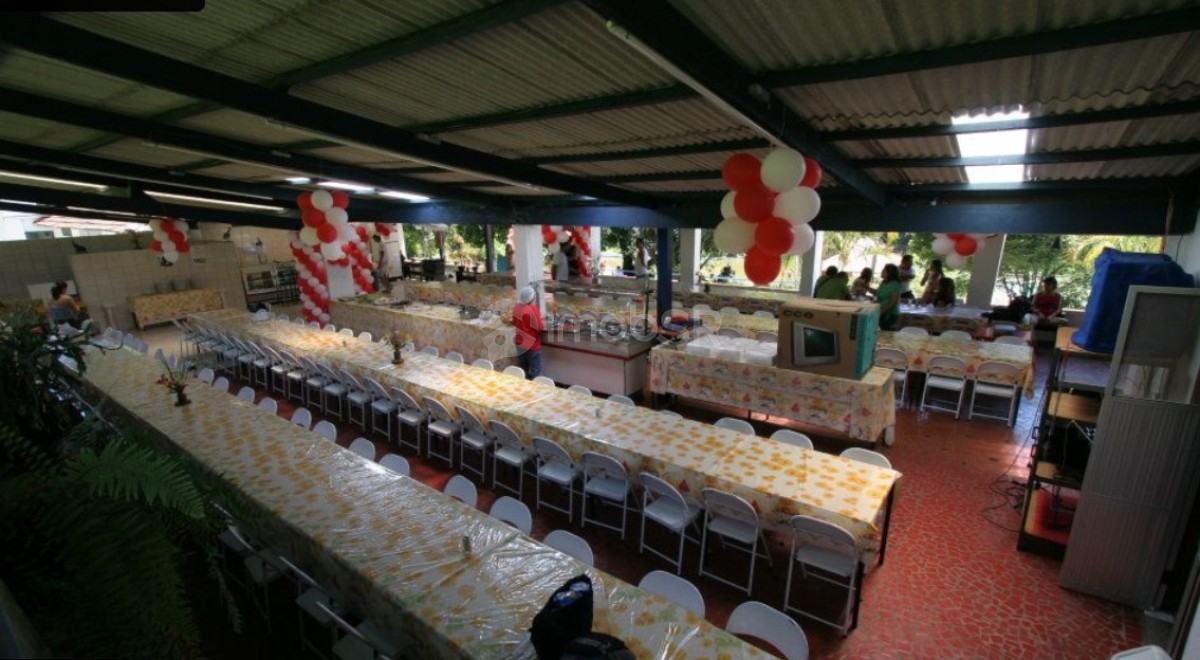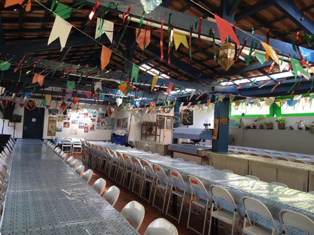 - Refeitório para 180 pessoas com cozinha industrial e dispensa, pia e bazar para bebidas, quartinho com 2 armários embutidos tipo dispensa.